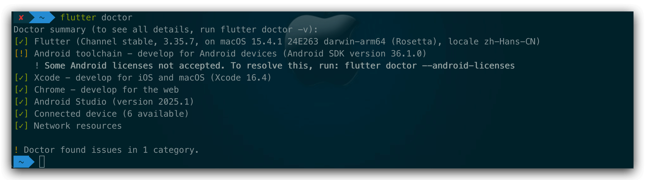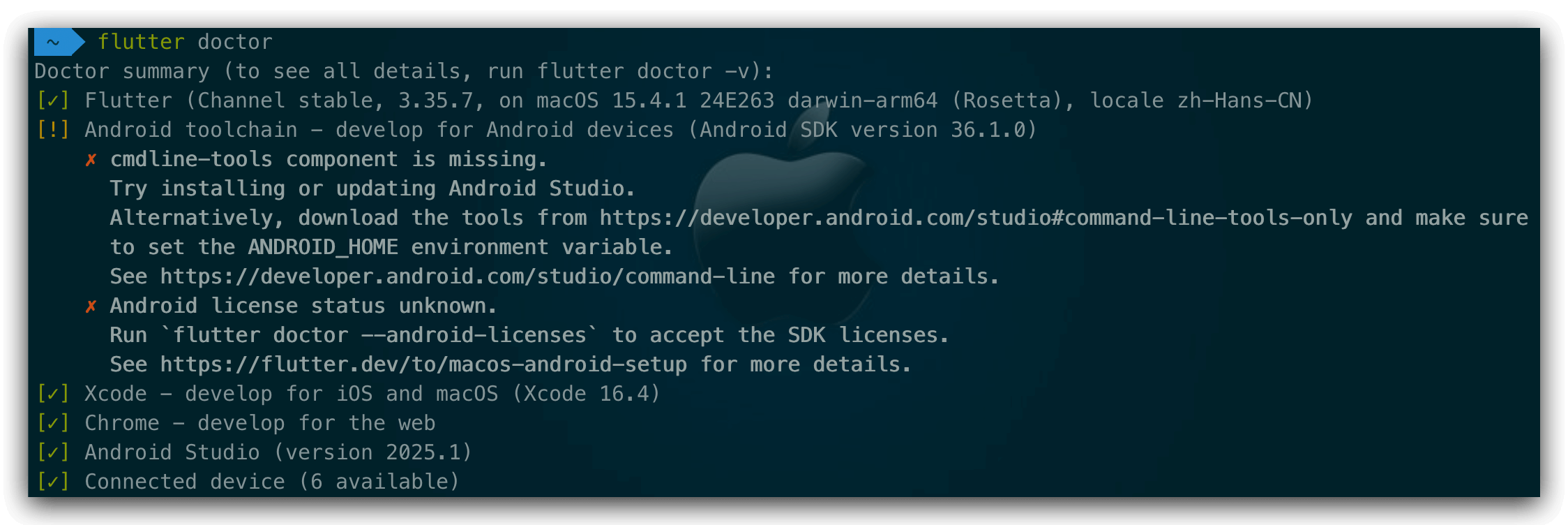 出现如上图的终端,就说明Flutter的开发环境配置成功了。