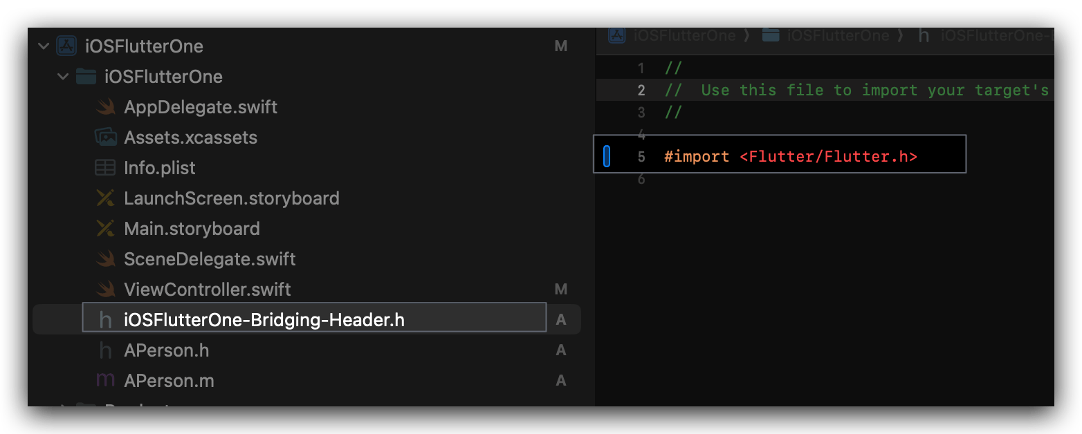 在如下图的 iOSFlutterOne-Brdging-Header.h 中: